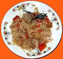 Bigos (Polish pronunciation: [ˈbʲiɡɔs]; Belarusian: бігас,[1] bihas, or бігус, bihus, Lithuanian: bigusas), often translated into English as hunter's stew, is a Polish dish of chopped meat of various kinds stewed with sauerkraut and shredded fresh cabbage. It is served hot and can be enriched with vegetables, spices or wine.[3]