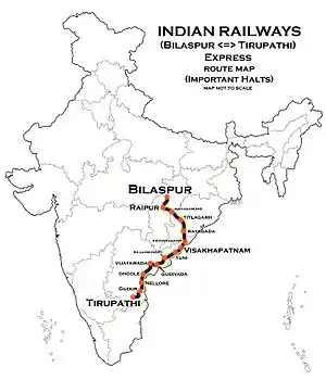 The 17481 / 17482 Bilaspur–Tirupati Express is an Express train belonging to South Coast Railway zone that runs between Bilaspur Junction and Tirupati in India. It is currently being operated with 17481/17482 train numbers on bi-weekly basis.[1][2][3][4]