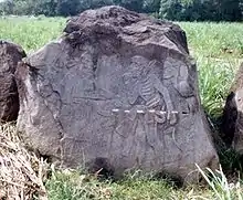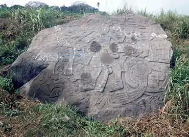 Monument 21 is a basalt boulder in a sugarcane field. The boulder has an artificially flattened upper surface bearing a bas-relief sculpture. The carved face has a 35° slope and measures 11 by 13 feet (3.4 by 4.0 m). The sculpture depicts three main figures. The central figure is the largest and faces towards a second figure seated on a throne. The third figure is behind the central figure, it is smaller and holds a hand puppet. The scene is filled out with twisting vines that sprout cocoa pods bearing human faces. Other details of the monument include birds, snakes and a butterfly with a human head. Monument 21 has been dated to the Classic period.[5] Monument 21 is located east of Mound 2, in the centre of Group B.[35] The decoration on the skirt of one of the figures may be the face of the central Mexican deity Xipe Totec.[13]