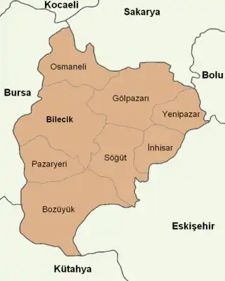 Bilecik Province (Turkish: Bilecik ili) is a province in midwest Turkey, neighboring Bursa to the west, Kocaeli and Sakarya to the north, Bolu to the east, Eskişehir to the southeast and Kütahya to the south, spanning an area of 4,307 km2. The population is 228,334. Most of the province laid down in Marmara Region but eastern parts of Gölpazarı and Söğüt district and districts of İnhisar and Yenipazar remained in Black Sea Region, smaller southeastern parts of Bozüyük and Söğüt remained in Central Anatolia Region and smaller southwestern part of Bozüyük remained in Aegean Region.