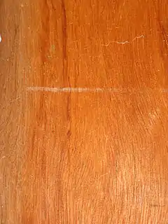 The wood, which grows across tropical Africa from Sierra Leone to Uganda, has about the same density as true hickory, but is not quite as strong.[1] The wood is extremely heavy.[2] Log diameter is from 60 to 90 centimetres (24 to 35 in).[3] The heartwood is golden yellow to orange yellow, and slightly shimmering. The sapwood has an interlocking grain.[4]