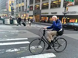He cultivated his own fashion signature, dressing in a uniform of black sneakers and a blue moleskin workman's jacket, his only accessory a camera. He traveled Manhattan by bicycle, repeatedly replacing those that were stolen or damaged in accidents. He praised the city's bike-sharing program when it launched in 2013: "There are bikes everywhere and it's perfect for the New Yorkers who have always been totally impatient. What I love, is to see them all on wheels, on their way to work in the morning in their business suits, the women in their office clothes ... It has a very humorous and a very practical effect for New Yorkers ... I mean, it's wonderful."[57] After breaking a kneecap in a biking accident in 2015, he wore a cast and used a cane to photograph a Mostly Mozart Festival gala.[58]