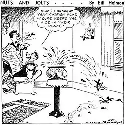 Holman's gag panel, Nuts and Jolts, was syndicated by the Chicago Tribune - New York News Syndicate from the 1930s to 1970. When Gaar Williams, who drew a gag panel under a variety of titles, died in 1935, Holman stepped in as a replacement. In July 1935, Holman picked up where Williams had left off, but the Nuts and Jolts title did not appear on the series until July 3, 1939. That same month, he began a Thursday panel, Zipper, about a dog.[8]