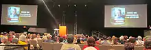 Over 70 media credentials were distributed for the event.[17] The debate was streamed live over the Internet at debatelive.org and Google+ Hangouts On Air.[18] Approximately 750,000 computers logged into the live stream.[19] The event was widely discussed on Facebook and Twitter, with commenters frequently employing the hashtag #HamonNye.[11] Approximately 10,000 groups from churches, schools, and colleges informed AiG of their intent to host viewing groups.[17] Christian public relations firm A. Larry Ross Communications estimated that almost 3 million people viewed the event live over the Internet.[19][20][21] Immediately after the debate, video footage was made available via YouTube.[18] C-SPAN aired the debate on February 19, 2014.[17]