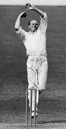 In the Second Test in Melbourne, O'Reilly opened the bowling as Australia opted to use only one pace bowler on a turning pitch.[54] After Australia had made only 228, O'Reilly trapped Bob Wyatt leg before wicket (lbw) before bowling both the Nawab of Pataudi and Maurice Leyland to leave England at 4/98. He later took two tail-end wickets to end with 5/63 and secure Australia a first innings lead. Defending a target of 251, O'Reilly bowled the leading English opener Herbert Sutcliffe for 33 with a textbook perfect leg break that pitched on leg stump and clipped the top of the off stump. According to English team manager Plum Warner, Sutcliffe had never been defeated so comprehensively. O'Reilly also removed Hammond on the way to ending with 5/66 and securing a 111-run win.[55][56][57] The ten-wicket haul was O'Reilly's first at Test level and the start of his strong career record over the English.[54] However, Australia were not to taste further success. The controversial "fast leg theory" bowling used by England under newly appointed captain Douglas Jardine brought the touring team victories in the last three matches: Australia were handicapped not only by the tactics, but also by a lack of quality fast bowlers; O'Reilly also opened the bowling in both the Third and Fourth Tests in Adelaide and Brisbane respectively due to the selection of only one paceman. He was hindered by a decline in the form of Grimmett, who was dropped after the Third Test.[50][58] O'Reilly took 2/83 and 4/79 in Adelaide, collecting the wicket of Sutcliffe for single figures in the first innings of a match overshadowed by near-riots after captain Bill Woodfull was struck in the heart.[59] Australia were crushed by 338 runs, and lost the series in Brisbane. After O'Reilly had taken 4/101—including Sutcliffe and Jardine—in the first innings to keep Australia's first innings deficit to 16, the hosts collapsed to be 175 all out. O'Reilly took one wicket in the second innings of a six-wicket loss.[60] The final Test in Sydney took a similar course; O'Reilly took 4/111 in the first innings including Sutcliffe and Jardine again, as the tourists took a 14-run lead before completing an eight-wicket win after another Australian collapse. O'Reilly was wicketless in the second innings and bowled 72 overs in total in the match. Reflecting on the performance of O'Reilly in the series, R Mason said "here we saw the first flexing of that most menacing genius".[61]
