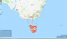 Within Tasmania, it can be found in the following municipals: Break O'Day, Brighton, Burnie, Central Coast, Central Highlands, Circular Head, Derwent Valley, Devonport, Dorset, Flinders Island, Florentine Valley, Georgetown, Glamorgan-Spring Bay, Glenorchy, Hobart, Huon Valley, Kentish, King Island, Kingborough, Latrobe, Launceston, Meander Valley, Northern Midlands, Sorell, Southern Midlands, Waratah-Wynyard, West Coast, West Tamar.[3]