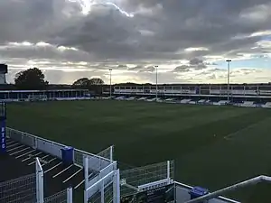 In 1980 a permanent 120-seat stand was built between the Cowshed and the clubhouse; its shape led to it becoming known as the Pacman stand.[13][14] During the 1980s a 200-seat stand was built on the side that had previously hosted the temporary seating, with the supporters club erecting several small areas of terracing.[13] In 1995 Billericay bought two stands that had been in use at Newbury Town's Faraday Road ground after the club went bust. One was installed next to the Cowshed and the other at the Blunts Wall End, with seats later installed in the Blunts Wall End stand.[13] The new stand adjacent to the Cowshed was soon moved to the other end of the pitch.[13] An area of covered terracing was added alongside the 200-seat stand.[14] Chelmsford City groundshared at New Lodge between 1998 and 2005.[17] In 2002 the club announced plans to move to a new 4,000-capacity stadium at Gloucester Park. However, the relocation was scrapped by new chairman Steve Kent in 2004.[18] By the summer of 2017 the ground had a capacity of 3,500, of which 424 was seated and 2,000 was covered.[16]