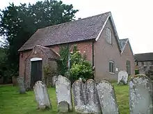 Billingshurst Unitarian Chapel is a simple Georgian Vernacular[9] building, "like a demure Georgian cottage".[7][19] It is a single storey high and has a two-window range with a gable-headed porch between the casement windows.[9][16] The wide façade of three bays has been described as similar to the former Southover General Baptist Chapel (now in residential use)[20] in Lewes, East Sussex.[21] The walls are of glazed grey and red brickwork laid in a Flemish bond pattern, and the roof is laid with tiles.[15][16] Ian Nairn and Nikolaus Pevsner noted that "the architecture is utterly self-effacing".[7] It is a good example of the contrast between the prominently sited, "wealthy established parish church with its centuries of tradition" and "the small impoverished Dissenting chapel", which occurs frequently in Sussex towns and villages.[11] The east side of Billingshurst High Street is dominated by St Mary's Church, with its landmark steeple and elevated position,[22] while "quietly hidden" behind iron fencing and hedges on the west side is the Unitarian Chapel.[11] The site measures 40 square feet (3.7 m2) and sits 8 feet (2.4 m) back from the High Street.[6]