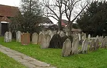 Worshippers from across northern Sussex came to this chapel; many were from the village of Billingshurst a few miles away.[4][6] This group later became large enough to split from the Horsham congregation and establish a chapel in their home village. They chose a grassy, raised site set back from the west side of the High Street,[7] and erected a modest cottage-like chapel in 1754.[note 1][7][8][9] The founders were William Turner and William Evershed, whose initials are recorded on a dated stone tablet inside.[10] Evershed was a General Baptist preacher at Horsham who moved to a farm in Billingshurst in 1742; together with Turner he held and preached at small meetings in Billingshurst.[6] The Evershed family maintained a 260 year connection with the chapel and more than 120 Eversheds of various generations, from William himself,[11] to Susie Evershed, who died in August 2022, aged 90,[12] are buried or commemorated in the graveyard,[13] a "surprisingly big" area which surrounds the chapel and helps it "make a display in spite of itself" and its modest architecture.[7] After making plans for a chapel in the village in 1753,[6] Turner and Evershed bought the site for three guineas (£510 as of 2023).[13][14] The chapel was registered for worship in October 1754;[6] its date of founding makes it one of the oldest Nonconformist places of worship in both the Horsham district and the whole of southeast England.[8][13]