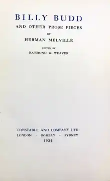 Melville began work on the novella in November 1886, revising and expanding it from time to time, but he left the manuscript in disarray. Melville's widow Elizabeth began to edit the manuscript for publication, but was not able to discern her husband's intentions at key points, even as to the book's title. Raymond M. Weaver, Melville's first biographer, was given the manuscript and published the 1924 version, which was marred by misinterpretation of Elizabeth's queries, misreadings of Melville's difficult handwriting, and even inclusion of a preface Melville had cut. Melville scholars Harrison Hayford and Merton M. Sealts Jr. published what is considered the best transcription and critical reading text in 1962.[1] In 2017, Northwestern University Press published a "new reading text" based on a "corrected version" of Hayford and Sealts' genetic text prepared by G. Thomas Tanselle.[2]