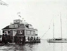 - The clubhouse is built on a foundation set in 10 feet of water directly opposite the Montross Hotel. A long pier connects the clubhouse with the shore. The building consists of four stories. On a level with the pier are the bathhouses and on either side of them are galleries with stairways leading down into the water. The second floor is reached by a stairway on the outside of the building, leading up directly from the end of the pier. Entering the hall, facing South, the reading room is on the left and the handsome ladies' parlors on the right. Directly behind these rooms and extending the full with of the building is the lounging room. The furniture is handsome in design and finish and lends an air of attractiveness to the apartment. The ladies' parlors are cozy laces, and are provided with every convenience. Behind the lounging room is a broad, long gallery, which accommodates 500 observers. From it one has a full view of the club's 15-mile course in the Mississippi Sound. The 3rd floor (when finished) will be devoted to billiard rooms and the 4th story, reached by a winding stair, is the observation tower. From it the Judges with the aid of glasses have a full sweep of the Sound and can easily follow the movements of the yachts.