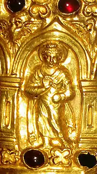 - "Standing Buddha in the arched compartment, flanked by figures of Brahma and Indra standing in similar compartments, detail of the side of Bimaran gold casket"[17]