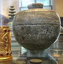 The casket is a small container reminiscent of the Pyxis of the Classical world. It was found without its lid. There is a lotus decorating the bottom.[4]