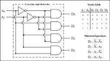 In digital electronics, a binary decoder is a combinational logic circuit that converts binary information from the n coded inputs to a maximum of 2n unique outputs. They are used in a wide variety of applications, including instruction decoding, data multiplexing and data demultiplexing, seven segment displays, and as address decoders for memory and port-mapped I/O.
