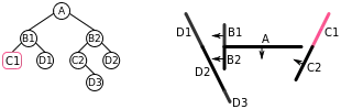 | vi. | We have now added all of the lines in front of A to the BSP tree, so we now start on the list of lines behind A. Choosing a line (B1) from this list, we add B1 to a node and split the remainder of the list into lines in front of B1 (i.e. D1), and lines behind B1 (i.e. C1). | ![]() |