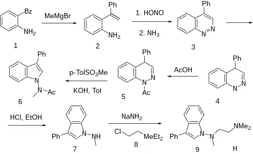 Grignard reaction of 2-aminobenzophenone [2835-77-0] (1) with methylmagnesium bromide and dehydration of the tertiary carbinol gives 2-(1-phenylvinyl)aniline [64097-92-3] (2). In an example of the Widman‐Stoermer Synthesis, treatment with nitrous acid followed by basification of the diazonium species with ammonia causes an intramolecular cyclization to afford 4-phenylcinnoline [21874-06-6] (3). Hydrogenation would give 4-Phenyl-1,4-dihydrocinnoline, CID:14175750 (4). The presence of acetic acid gives (5). The reaction with Methyl p-toluenesulfonate [80-48-8] leads to CID:20337750 (6). Acid hydrolysis gives N-methyl-3-phenylindol-1-amine [57647-15-1] (7). Sodamide is then used to abstract the amine proton; alkylation of then anionic species with 2-dimethylaminoethylchloride [107-99-3] (8) then concludes the synthesis of binedaline (9).