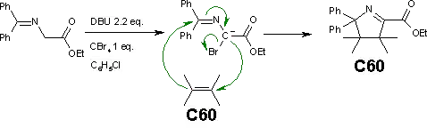 An alternative to the Bingel reaction is a fullerene diazomethane reaction. N-(Diphenylmethylene)glycinate Esters [3] in a Bingel reaction take a different conjugate course and react to a fullerene dihydropyrrole.