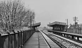 Despite new construction along the route of the line, passenger loadings were light and working expenses generally exceeded farebox revenue.[17][2] The line was a candidate for wartime economies during the First World War and the halts at Bingham Road and Spencer Road were closed on 14 March 1915 upon which the railmotor service ceased, with full closure of the line following on 31 December 1916.[17][6][18][19][8] The line was reopened and electrified by the Southern Railway on 30 September 1935.[20][19][8] Bingham Road was rebuilt at a cost of £10,000, with brick entrances and covered staircases provided either side of the road underbridge, as well as concrete platforms covered by wood and steel glass canopies.[17][21][22]