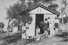 One camp was arranged for one month over the Christmas period of 1933. Accommodation was in tents, a cook supplied meals and there were daily guided picnics into the National Park - all for five shillings a day. The directors hoped that if attendance was good the company would be floated. The limit of 40 was booked out within days so the number was raised to 80. The problem of carting luggage was overcome with the help of Walter Muller (Old Bill) who was to become an identity at Binna Burra for many years. He also worked for the Lahey family company in the Canungra sawmill and on associated roadwork. The weather was mild on the first few days of the camp, however on Boxing Day there was a cyclonic storm that did not let up until after the New Year. Although everything became sodden the campers would not hear of closing the camp down. The camp was extended a further two weeks to a total of six allowing for a week or two of fine weather. During the first Christmas camp a hoop pine tree was planted by Romeo Lahey and used as a Christmas tree. The ceremony was repeated at the 50th anniversary of the camp at Christmas 1983.[1]