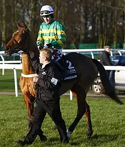Binocular's first major win in a Grade 1 race came in April 2008. With jockey McCoy at the helm, he went on to win the 2008 Anniversary 4-Y-O Novices' Hurdle at Aintree Racecourse in Aintree, Merseyside, England where he beat Celestial Halo by 7 lengths.[4] Binocular's other major Grade 1 National Hunt win came in the Champion Hurdle in March 2010 at Cheltenham Racecourse when he beat Khyber Kim by 3.5 lengths.[5] Binocular had originally been ruled out of the Champion Hurdle due to a muscle problem,[6] and he drifted out to as high as 999–1 to win the race.[7] However, McManus and McCoy later decided he was fit to run.[8] By winning the Champion Hurdle, he denied 4-1 race favourite[9] Go Native the chance to become the first horse to win the Triple Crown of Hurdling.[7]