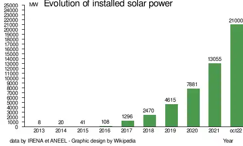 In October 2022 Brazil reached 22 GW of installed solar power.[20][21] In 2021, Brazil was the 14th country in the world in terms of installed solar power (13 GW),[22] and the 11th largest producer of solar energy in the world (16.8 TWh).[16]