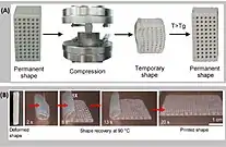 The most popular biofoam in the use of biomedical devices is PLA as well. PLA's properties are also desirable in biomedical applications, especially in combination with other polymers.[26] Specifically, its biocompatibility and biodegradability make it favorable in tissue engineering through the use of FDM-3D printing.[26] PLA does well in these printing environments as its glass transition temperature as well as shape memory is small.[21] In recent studies, PLA has been specifically combined with hydroxyapatite (HA) in order to make the modulus of the sample more favorable for its application in repairing bone failure.[26] Specifically in tissue engineering, HA has also been shown to generate osteogenesis by triggering osteoblasts and pre-osteoblastic cells.[27] HA is a strong material, which makes it ideal to add to PLA, due to the fact that PLA has weak toughness with a 10% elongation before failure.[26] FFF-based 3D printing was used as well as compression tests demonstrated in Figure 5.[21] The results showed that there was a self-healing capability of the sample, which could be used in certain biomedical practices.[21]