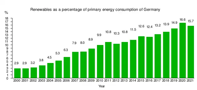 As of 2015 Germany's primary energy consumption of 13 218 petajoules or 3 672 terawatt-hours refers to the total energy used by the nation. The final renewable energy consumption, split by the sectors, and with their relative share, are:[5]: 4, 5, 10