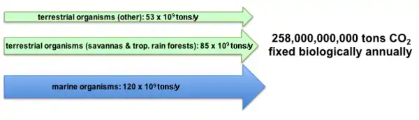 Graphic showing net annual amounts of CO2 fixation by land and sea-based organisms.
