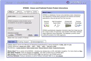 - Szklarczyk D; Franceschini A; Kuhn M; et al. (January 2011). "The STRING database in 2011: functional interaction networks of proteins, globally integrated and scored". Nucleic Acids Res. 39 (Database issue): D561–8. doi:10.1093/nar/gkq973. PMC 3013807. PMID 21045058.