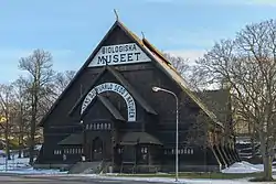 Biologiska museet is a museum located in Djurgården in Stockholm. It exhibits a collection of stuffed European birds and mammals in dioramas. Some of the diorama backgrounds were created by artist Bruno Liljefors, known for his dramatic paintings of Scandinavian wildlife. The museum was built in 1893 after a design by architect Agi Lindegren who was inspired by medieval Norwegian stave churches.[1]