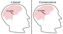 Studies have found that subjects with right-wing, or conservative in the United States, political views have larger amygdalae and are more sensitive to disgust. Those with left-wing, or liberal in the United States, political views have larger volume of grey matter in the anterior cingulate cortex and are more attentive to incongruent information. Conservatives have a stronger sympathetic nervous system response to threatening images and are more sensitive to threatening facial expressions. [3]