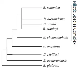 Biomphalaria choanomphala is apart of the "Nilotic Species Complex" alongside B. alexandrina, B. angulosa, B. smithi, B. stanleyi and B. sudanica.[4]