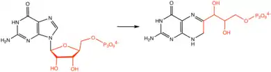 In the de novo pathway, GTP is converted to 7,8-dihydroneopterin triphosphate by GTP cyclohydrolase I (GTPCH-1, FolE), which expands the imidazole ring in GTP by one carbon. The intermediate is converted to 6-pyruvoyl-5,6,7,8-tetrahydropterin by 6-pyruvoyltetrahydropterin synthase, which removes the phosphate and produces the diketone (pyruvoyl) substituent. The final stage is mediated by sepiapterin reductase.[5]