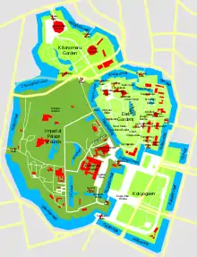 The Tokyo Imperial Palace is situated in the center of Chiyoda-ku, Tokyo. It is 115 hectares (280 acres) in size and encircled by moats. The Palace is divided into the eastern part and the western part by the Kan-Moat and Hasuike Moat. The eastern part is called the Imperial Palace Eastern Garden and has been open to the public since 1968.[1] In the western part are: the Fukiage Gyoen (Garden), including the Imperial residence, the Palace, and the Imperial Household Agency. An attempt to maintain or recreate its natural state is evident in the Fukiage Garden. The Palace lies on the tip of Musashino Terrace, between the Arakawa River, plus Iruma River and Tama River. There are moats at the northern and western end of the Palace. The height of the Palace is from 8 to 30 metres (26 to 98 ft), with the lowest point being at the Shimo-Dokan Moat.[2] The eastern end faces the low areas of Tokyo. The Palace is encircled by moats, any of which have been created artificially, since stones had been carried from other places. According to the Meteorological agency neighboring the Palace, the mean temperature is 15 °C (59 °F). The difference in mean temperature of summer and winter is about 30 °C (86 °F). The precipitation is of considerable degree in summer and autumn, while it is minimum in winter.[3]