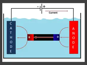 Current flowing in the BPE because it provides less resistive current path than the electrolyte. As illustrated in the Figure; as consequence of the current entering side (D/Blue) from the anode, side D will polarise cathodically (potential will become more negative). At the other hand, side (B/Red) where the current is leaving, it will polarise anodically (potential will become more positive) and will corrode. This is due to polarisation which occurs opposite to the current direction.[6]