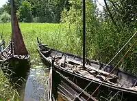 "The site found consisted of a stone-lined depression in the Viking Age shore zone with a wooden boat slip at the bottom. The finds at the site consist of large quantities of both unused and used boat rivets, whetstones made from slate and woodworking tools."[24]