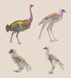Birds have many bones that are hollow (pneumatized) with criss-crossing struts or trusses for structural strength. The number of hollow bones varies among species, though large gliding and soaring birds tend to have the most. Respiratory air sacs often form air pockets within the semi-hollow bones of the bird's skeleton.[1] The bones of diving birds are often less hollow than those of non-diving species. Penguins, loons,[2] and puffins are without pneumatized bones entirely.[3][4] Flightless birds, such as ostriches and emus, have pneumatized femurs[5] and, in the case of the emu, pneumatized cervical vertebrae.[6]