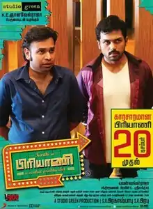 Biriyani is a 2013 Indian Tamil-language action comedy thriller film[1][2] written and directed by Venkat Prabhu.[3][4] Produced by Studio Green, it stars Karthi and Hansika Motwani alongside an ensemble cast including Premji, Nassar, Ramki, Sampath Raj, Madhumitha, Jayaprakash, Prem, and Mandy Takhar. Yuvan Shankar Raja composed the score and soundtrack of Biriyani, which marks his 100th film, while Sakthi Saravanan and Praveen-Srikanth handled cinematography and editing, respectively. Filming started in November 2012, lasted for over nine months and took place primarily at Chennai, Hyderabad and Ambur. The film was released on 20 December 2013. The fim received positive reviews from critics. The film was reported to be inspired by the 2004 American film Harold & Kumar Go To White Castle, though Prabhu was lauded for making creative changes to the story.[5] The film did a decent run and recovered its budget at the box-office.[6]