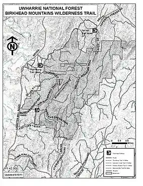 The Birkhead Mountains Wilderness was established by the 1984 North Carolina Wilderness Act, and it covers 5,160 acres (20.9 km2) in the Uwharrie National Forest at the northern end of the Uwharrie Mountains, in central North Carolina. The goals are to protect and preserve its natural resources and wilderness character and provide for public use.[1]