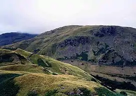 The principal rocks of the summit area are the pebbly sandstones of the Blind Cove Member. The flanks carry andesite sills and volcaniclastic sandstone.[1]