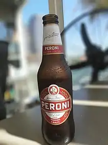 Peroni is the Peroni company's original brand. According to Assobirra,[7] it is the best selling beer in Italy. It is 4.7% abv and made with barley malt, maize, hop pellets and hop extract. By the 1950s and 1960s, Peroni was the most recognized brand of beer throughout the Italian peninsula and in 2019 was one of the five most popular Italian beers in the world.[8] Peroni is also available as a lemon flavour, named chill lemon.[9]