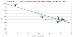 About 222 million women who want to avoid pregnancy in developing countries are not using a modern birth control method.[17][18] Birth control use in developing countries has decreased the number of deaths during or around the time of pregnancy by 40% (about 270,000 deaths prevented in 2008) and could prevent 70% if the full demand for birth control were met.[19][20] By lengthening the time between pregnancies, birth control can improve adult women's delivery outcomes and the survival of their children.[19] In the developing world, women's earnings, assets, and weight, as well as their children's schooling and health, all improve with greater access to birth control.[21] Birth control increases economic growth because of fewer dependent children, more women participating in the workforce, and less use of scarce resources.[21][22]