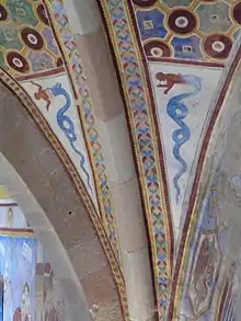 One of the oldest depictions of the Biscione is in the Great Hall of the Visconti Castle of Angera. The hall was painted at the end of the 13th century with frescoes celebrating Archbishop Ottone Visconti's victory against the rival family of the Della Torre. The viper swallowing a small human figure is depicted in the pendentives of the hall.[3]
