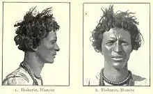 The Beja inhabiting Sudan also speak Sudanese Arabic as a second language.[3] In 1949, a member of the Bishari tribe stated that when they meet a stranger, they immediately ask "'Are you biggaweijet (=Bišari) or belaeijt (Arab)?'" and continued "‘...We call our language biggawija and it contains many elements of Arabic (belaeijet).'"[4]
