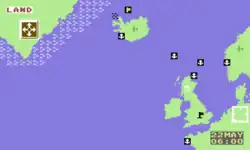 If the Bismarck has been intercepted or compromised by Royal Navy ships, the game will automatically shift to an arcade sequence which will give the player an opportunity to defend the ship against a British attack, or alternatively, if playing as the British, the sequence is utilised in order to destroy the Bismarck.[1] The feature can be displayed at any time, though it is automatically enabled if either side comes into conflict.[3] The interface of the feature is split into three sections; the upper part of the screen shows a view of the ocean in front of the ship and any hostile ship in the vicinity. The middle section contains buttons and icons which are used to control ship movement and to fire weapons. The lower part of the screen displays a diagrammatic representation of the ship from the side chosen (Bismarck or Royal Navy ships); the diagram will change colours once the ship receives damage from shelling.[3]