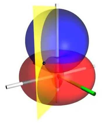 Illustration of bispherical coordinates, which are obtained by rotating a two-dimensional bipolar coordinate system about the axis joining its two foci. The foci are located at distance 1 from the vertical z-axis. The red self-intersecting torus is the σ=45° isosurface, the blue sphere is the τ=0.5 isosurface, and the yellow half-plane is the φ=60° isosurface. The green half-plane marks the x-z plane, from which φ is measured. The black point is located at the intersection of the red, blue and yellow isosurfaces, at Cartesian coordinates roughly (0.841, -1.456, 1.239).