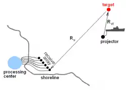 For coastal surveillance, a large receive array of hydrophones is usually deployed close to the shore and connected with cables to a land-based processing center. To enable long range target detection (far away from the shore), one can use a powerful mobile projector, deployable from the ship. A system of this kind exploits the idea of “bringing the projector closer to area of interest and getting the transmission loss down”.