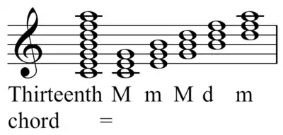 Polytonality requires the presentation of simultaneous key-centers. The term "polychord" describes chords that can be constructed by superimposing multiple familiar tonal sonorities. For example, familiar ninth, eleventh, and thirteenth chords can be built from or decomposed into separate chords: