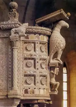The existing church however is a Romanesque building of the late 11th-12th centuries, influenced by the Basilica of San Nicola in Bari. The west front is divided into three parts and has three portals (the central one of which is sculpted with plant motifs and scenes from the Old Testament), four mullioned windows and a rose window flanked by sculptures of animals supported by small columns. The interior has a nave and two aisles, and is also notable for its sculpture. The main artwork is the marble ambo, a combined pulpit and lectern, of 1229, a masterpiece of medieval Apulian stonecarving. In the crypt is a tile of a griffin, a survival from the predecessor church building.