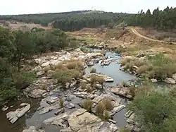 The ultimate source of the river is at over 2,000 m a.s.l. in the uplands north of Utrecht.[2] It flows between rolling uplands dotted with commercial plantations, passing under the Kruger Bridge of 1898, before reaching Pivaansbad south of Paulpietersburg, where hot springs and the Natal Spa resort are located. Downstream it enters open but hilly terrain until it enters the Bivane Dam, where the Bivane Dam resort and a nature reserve of 2,000 ha are located. Downstream of the dam the river enters more rugged terrain, and the turbulent waters are popular with canoeists, and besides for river rafting. This area is also the starting point for the annual Ithala Challenge Canoe Marathon.[3] The river has a confluence with the Pongola on the western boundary of the Ithala Game Reserve, not far from the border with Eswatini.